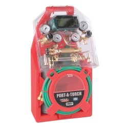 LEWKH657 Features and Benefits: -Complete cutting and brazing kit with goggles, flint striker, 12 ft hose, welding tip, cutting tip; plus empty gas and oxygen cylinders with light weight tote carrier. -Cuts up to 5 inch thickness - cuts thick metal plates. -Welds up to 1/2 inch thickness - industrial capacity. -Portable - off site use. Used in plumbing, HVAC, maintenance, general repairs and anywhere portability is a must. DROP SHIP ONLY -Port-A-Torch.-30 day warranty on material and workmanship.